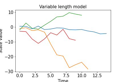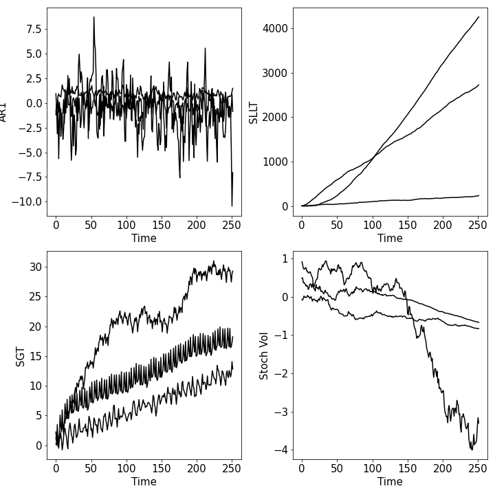 Every one of these models can be sampled from, as we do above, and can be confronted with data by wrapping it in an stsb3.sts.NoiseBlock instance, or by embedding the model within a more general pyro stochastic function (again more on that later). Underneath, stsb3 implements a context-sensitive model grammar that allows for arbitrary addition and composition of models as long as certain parameter space restrictions are met. (The grammar is detailed in a paper, if you care.) The point is that stsb3 allows you to easily construct expressive time series models that are always interpretable by definition.