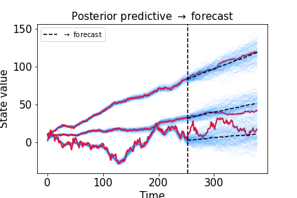 There are a few things going on in this model that we haven’t explicitly encountered before. First, we apply a nonlinear transformation explicitly to our block. stsb3 supports a few common nonlinear transformations of sample paths, such as exp, softplus, cos, etc. Second, there’s some funny business with util.set_cache_mode and util.clear_cache that bears explaining. In our pyro_model we call .model(...) on our block twice. The interpretation of this is ex ante ambiguous – if you tried this with pyro, you’d get an error saying something to the effect that you’ve tried to add the same random address to your trace twice. This is normally how stsb3 works too, but if you want to call a single block multiple times during a single execution, you can do so by turning on memoization using util.set_cache_mode. On the first call to the block, or when the cache is empty, the model is run as normal and a trace is recorded, but any subsequent calls just use the recorded execution trace. This is why we’re explicitly clearing the cache at the end of each call to our pyro_model function.