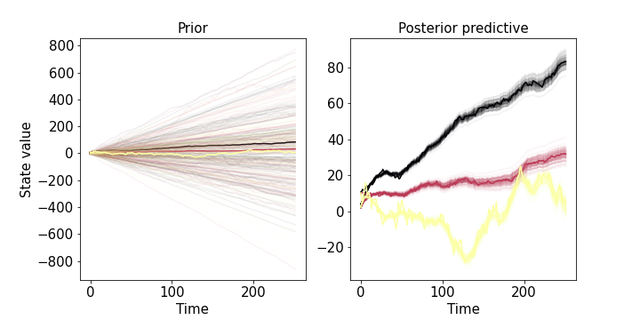 After training, we can inspect the prior and posterior predictive empirical densities of what we’ve modeled as a latent random walk: