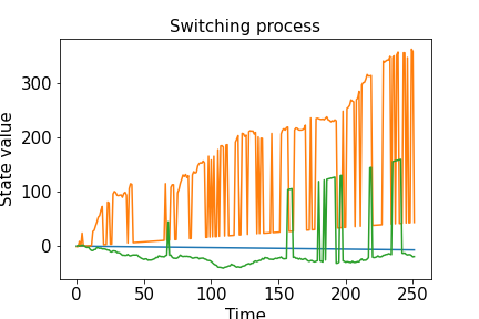 Earlier we promised to implement a switching model. Let’s do that. The model itself is really simple – we’ll outsource the actual definition of the component time series x, y, and z to other blocks. The switching mechanism is defined in pseudocode thus: